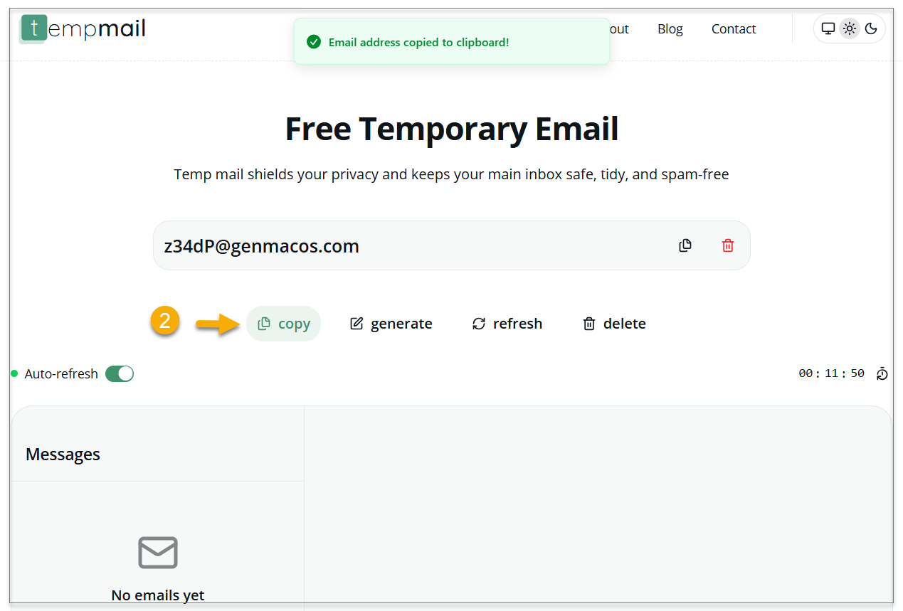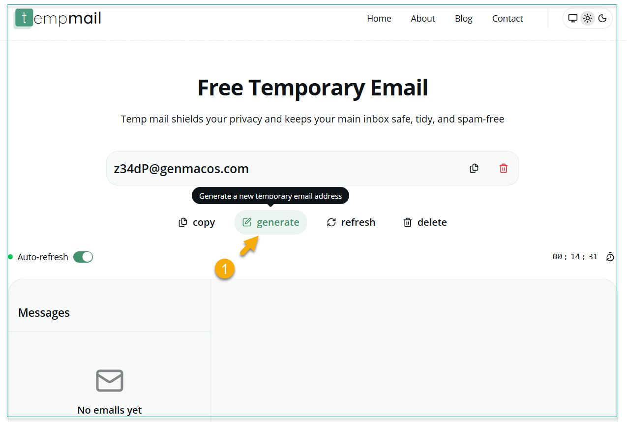 When you visit our homepage, a temporary email or gmail address is generated by clicking "generate" and that instanly provides with one. You'll see it displayed in the main interface. No forms to fill out, no registration needed.